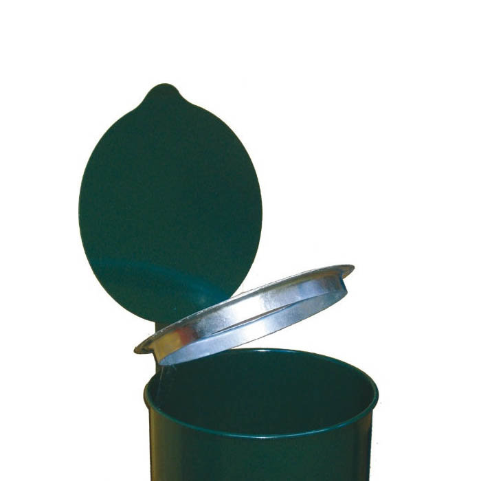 Papperskorg med lock och klämring för soppåse tillverkad i varmgalvaniserad plåt samt pulverlackerad.