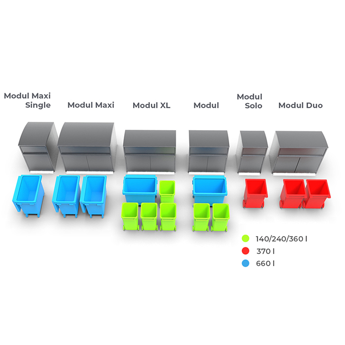 Kärlskåp Modul XL är ett förvaringsskåp för avfallstunnor och avfallskärl, som är framtagna till de standardiserade avfallskärlsmodellerna. Ett förvaringsskåp har plats för ett 660 + 240 eller tre 140/240/360 liters avfallskärl. Kärlskåpen kan tillkopplas på varandra i gavlarna och på så sätt går det att bygga ihop flera skåp så det passar dina krav.