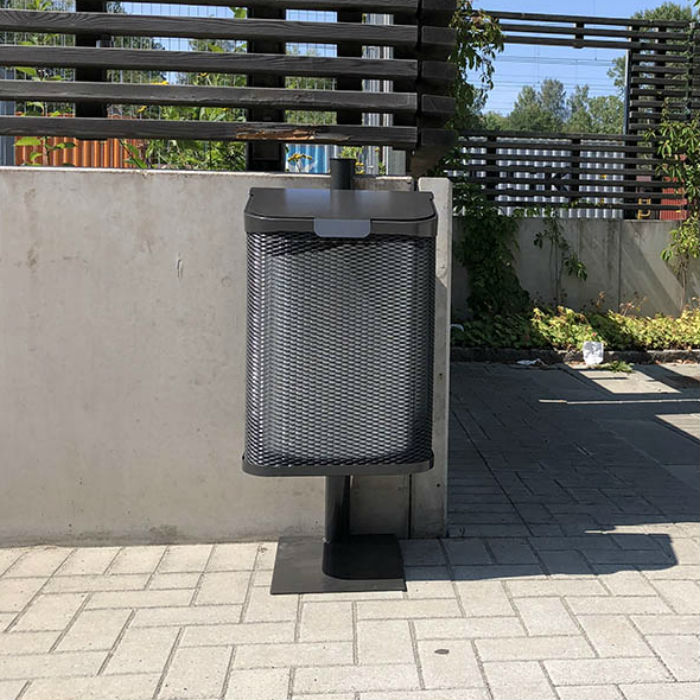 Caddy är tillverkad av sträckmetall i stålkonstruktion och pulverlackerad i gråmetallic. Tunnans innerdel i galvaniserad plåt, slät insida för att skydda uttag av soppåsen. Låsbygel som låser påsens överdel. Med hjälp av det fästet som medföljer kan papperskorgen monteras både på vägg och på 60 mm-stolpar.