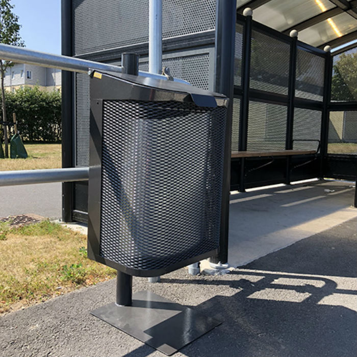 Caddy är tillverkad av sträckmetall i stålkonstruktion och pulverlackerad i gråmetallic. Tunnans innerdel i galvaniserad plåt, slät insida för att skydda uttag av soppåsen. Låsbygel som låser påsens överdel. Med hjälp av det fästet som medföljer kan papperskorgen monteras både på vägg och på 60 mm-stolpar.