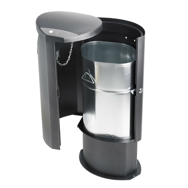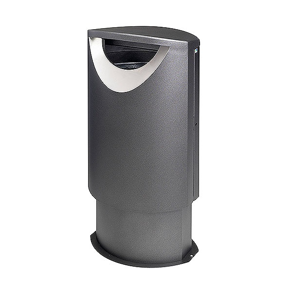 En papperskorg med innovativ design som präglas av hög kvalité och perfekt finish, finns både med och utan askkopp. Öppningens precisa form och storlek håller nederbörd och fåglar borta. Genom att öppna fronten i sidled och lyfta på toppen ges möjlighet till underhåll samt tömning.