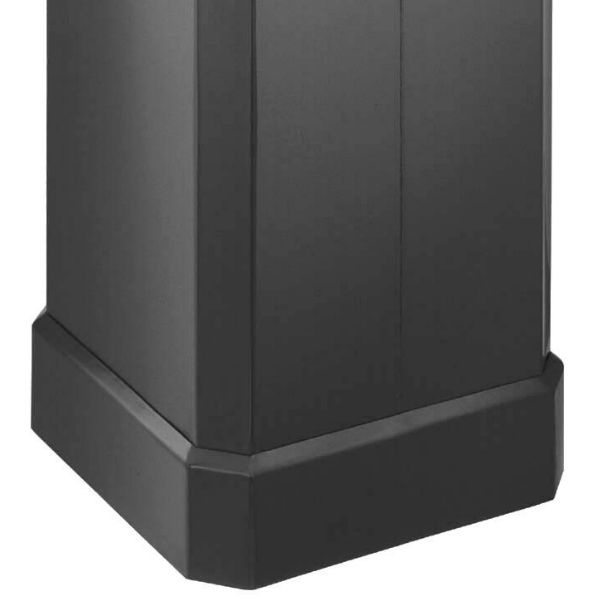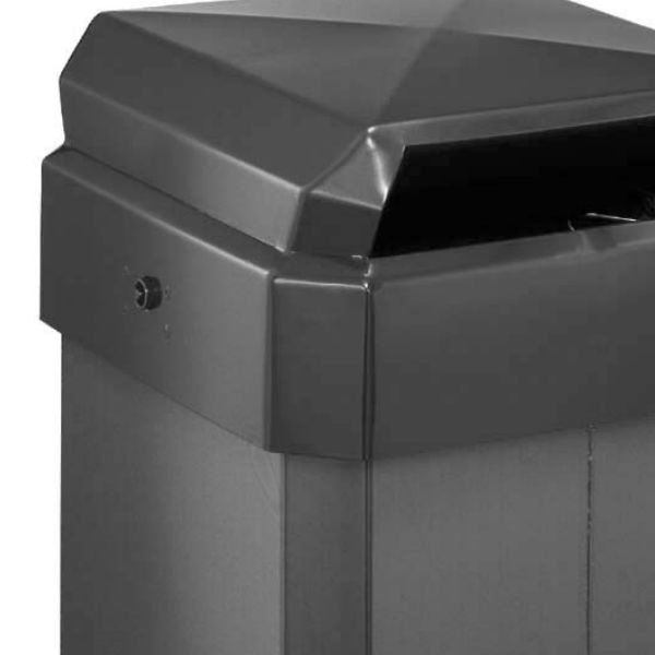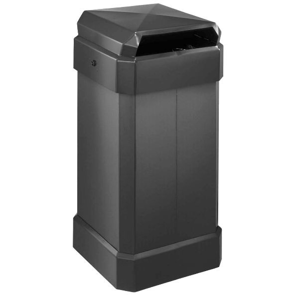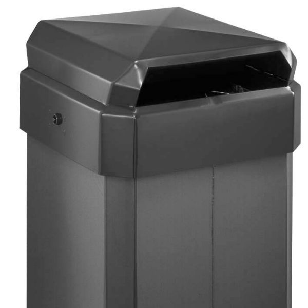 En stabil papperskorg med inkast från sidan som ger ett optimalt skydd för regn och snö. Tillräckligt brett inkast för att kasta en pizzakartong samtidigt som höjden på inkasten är så lågt att kråkorna inte kommer åt skräpet.