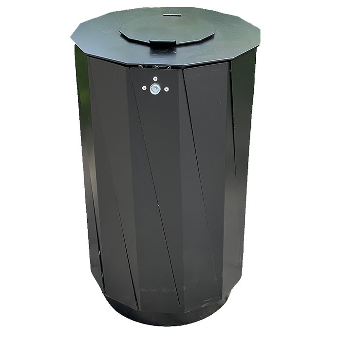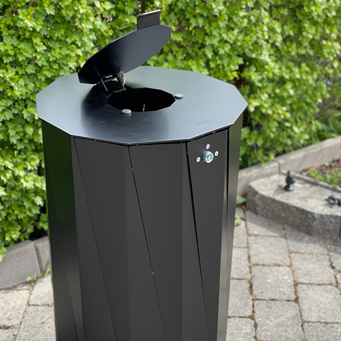 En stor och snyggt designad papperskorg i lackerad 2-4 mm varmgalvaniserad plåt med ett inkastlock upptill. Tack var de dubbla locken görs det att t.ex. hushållssopor är för stora för att kastas i papperskorgen, locket kan endast öppnas 57 grader och är självstängande för att dessutom försvåra för fåglar som vill ta sig in i papperskorgen. En populär papperskorg där design är lika viktigt som att ha en stor papperskorg.