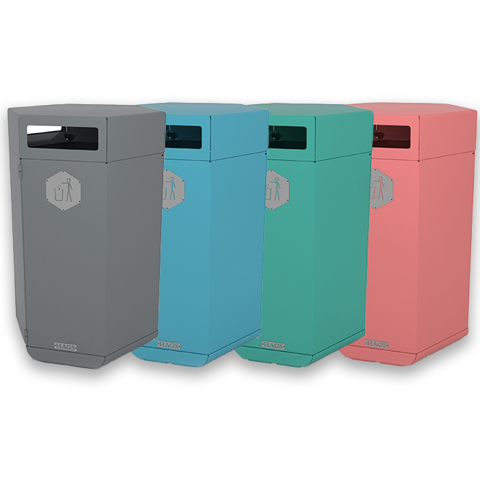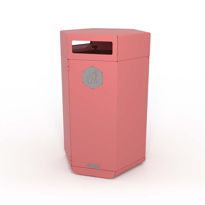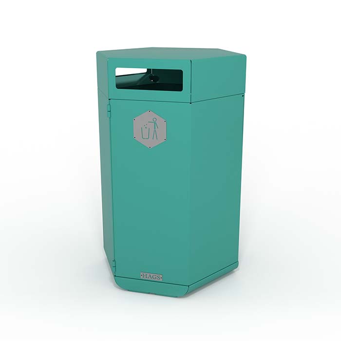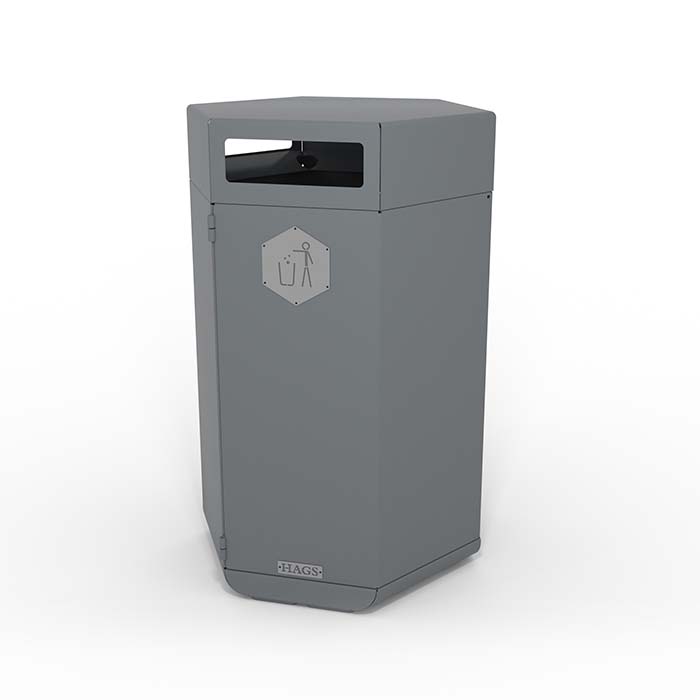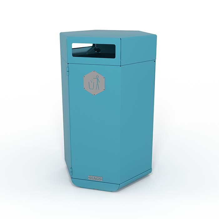 En stor papperskorg med kapacitet på 160 liter i en elegant hexagonform som dessutom finns i fyra olika färger vilket gör att den lätt passar in i utemiljön. Med sin höjd på över en meter (1043 mm) är det svårt att missa vart man ska kasta sitt skräp.
