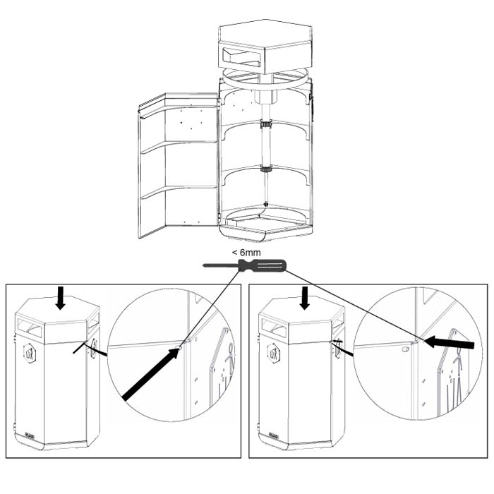 Tömning sker genom att öppna luckan på framsidan genom att trycka in nyckeln i hålet på högersidan av dörren som gör att locket lossnar och dörren öppnas. sedan lossas sopsäcken från byglarna på insidan. Film på hur man gör finnes här.