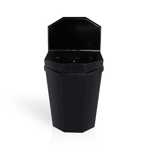 Effektiv och rejäl papperskorg för tuffa offentliga utemiljöer konstruerad av två mm varmgalvaniserad stålplåt som pulverlackerats i svart (RAL 9005).
