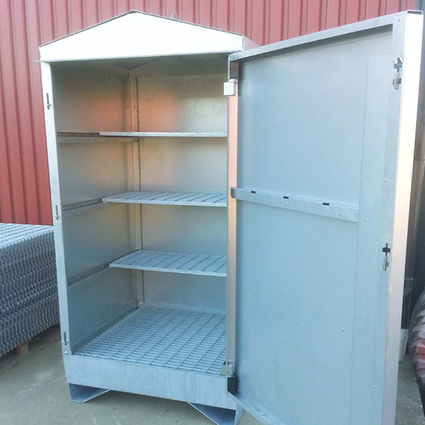 Miljöskåp med en dörr, utformat för insamling och förvaring av farligt avfall. Skåpet är utrustat med tre hyllplan och har en uppsamlingsvolym på 120 liter.