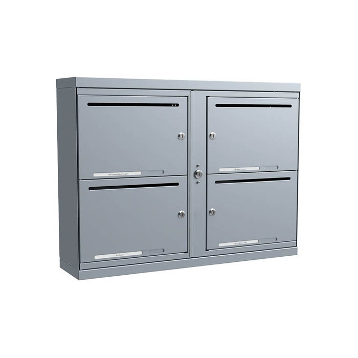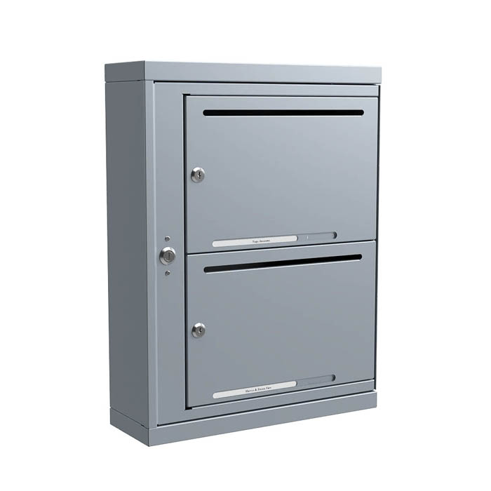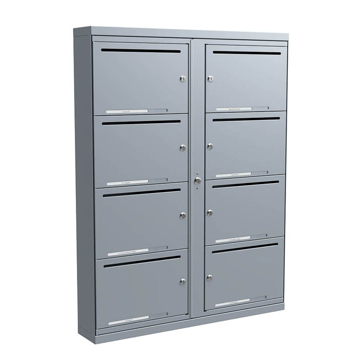 Fastighetsbox med stående fack, vilket gör den väldigt väggnära och enkel att placera i smalare trapphus. Den kan monteras antingen på eller infälld i vägg, eller på stativ (finns som tillval). Varje facks innerstolek är 370 x 145 x 226 mm.