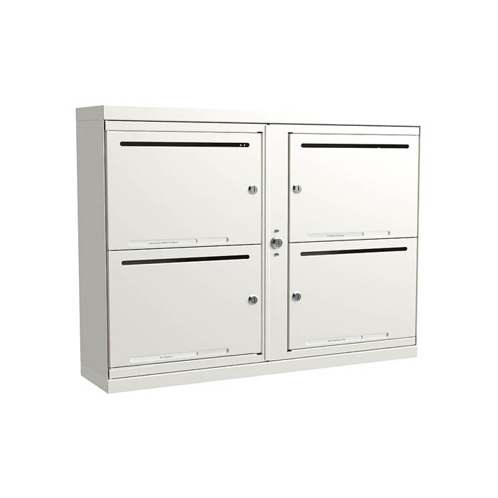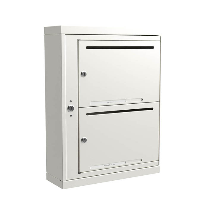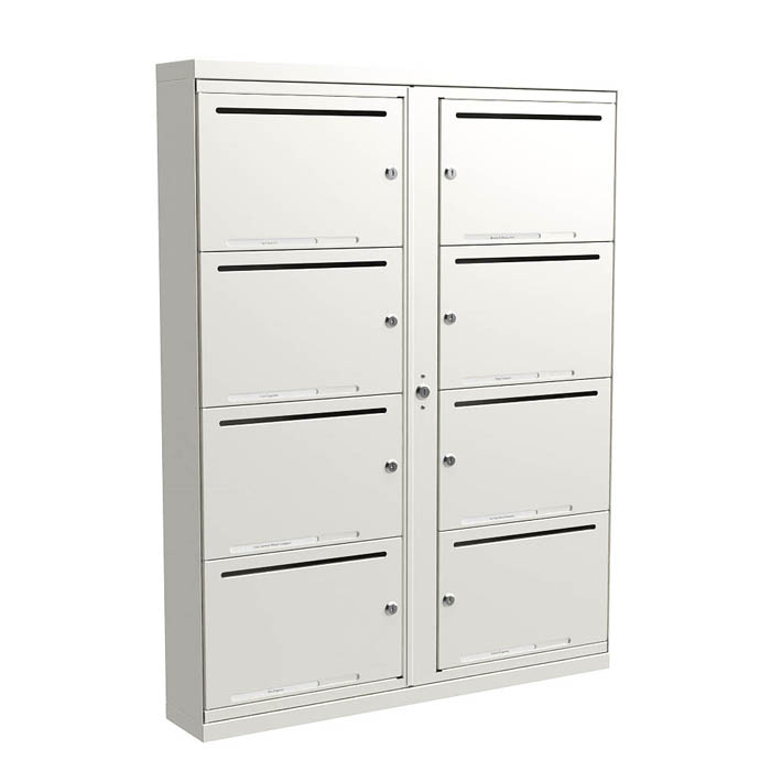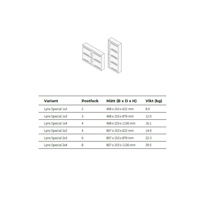 Vi svensktillverkad fastighetsbox med stående fack, gör den väggnära och perfekt för smalare trapphus. Den kan monteras antingen på eller infälld i vägg, eller på stativ (finns som tillval). Varje facks innerstolek är 370 x 145 x 226 mm.