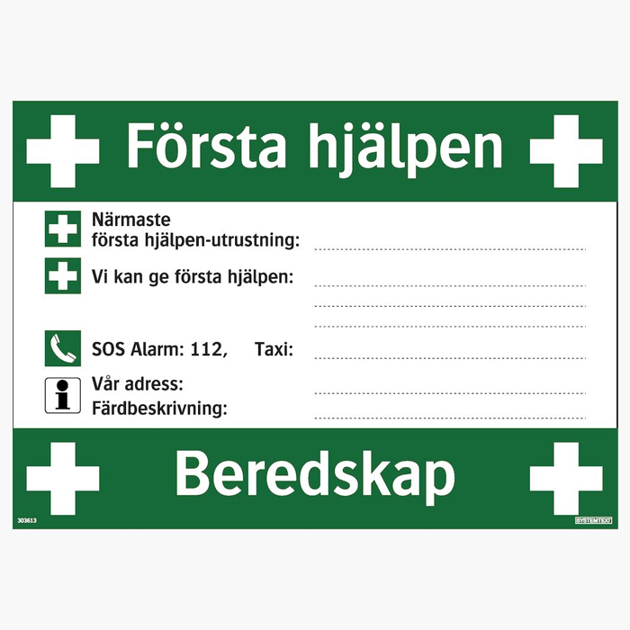 Skylt i hårdplast som är 297x420 mm där man själv fyller i viktig information som gäller vid nödsituationer. Lättast är att använda en vattenfast penna för att fylla i all information (kommer ej färdigryckt).