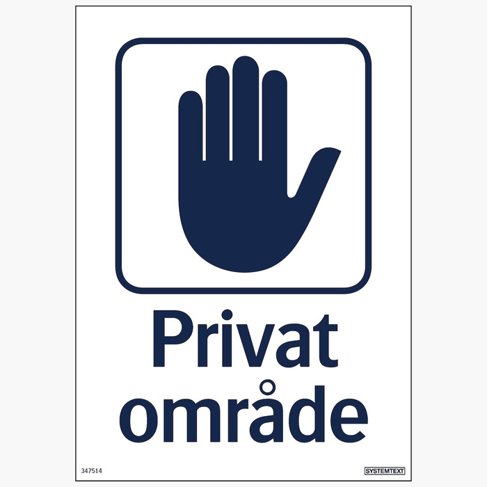 Skylt som med både symbol och text ger information om privat område, tillverkad i slitstark plast och har en storlek på 210x297 mm. Passar bäst på plana ytor.