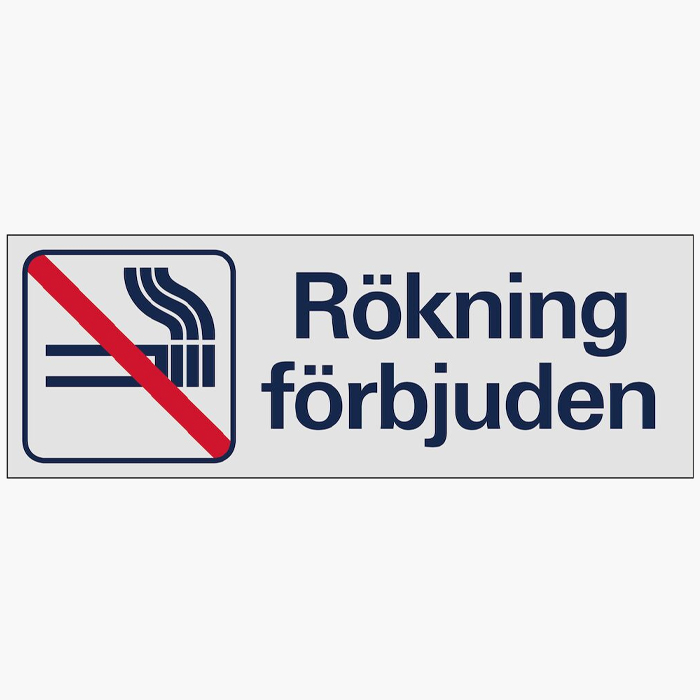 En skylt på 225x80 mm tillverkad i aluminium som informerar om att rökning är förbjuden. Levereras oborrad och passar bäst på plana ytor.