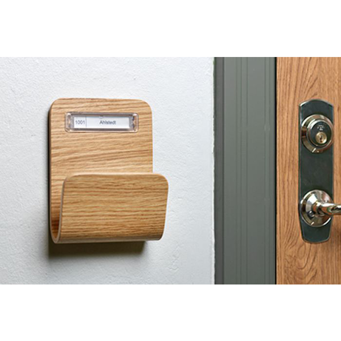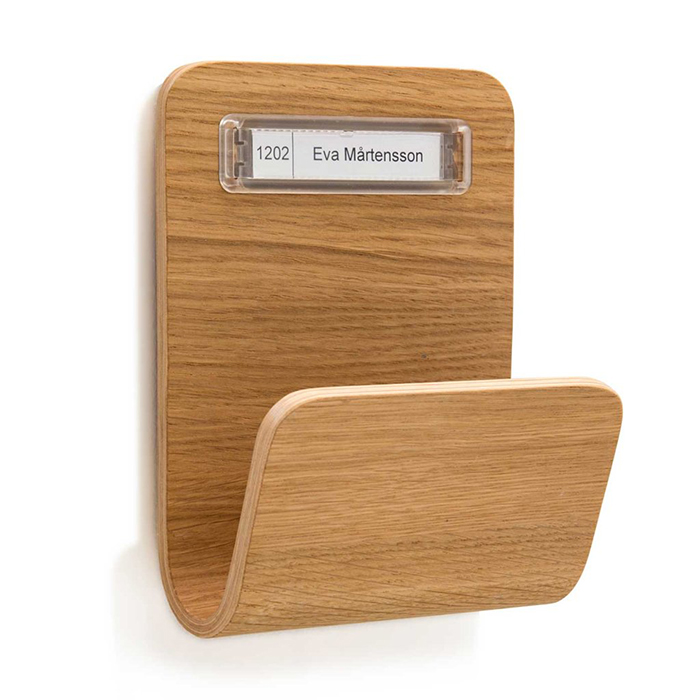 Stilren tidningshållare i brandskyddslackad formpressad Ek-plywood med namnskylt av postfackstyp. Med en tidningshållare så får du tidningen levererad utanför dörren trotts att fastigheten har fastighetsboxar.