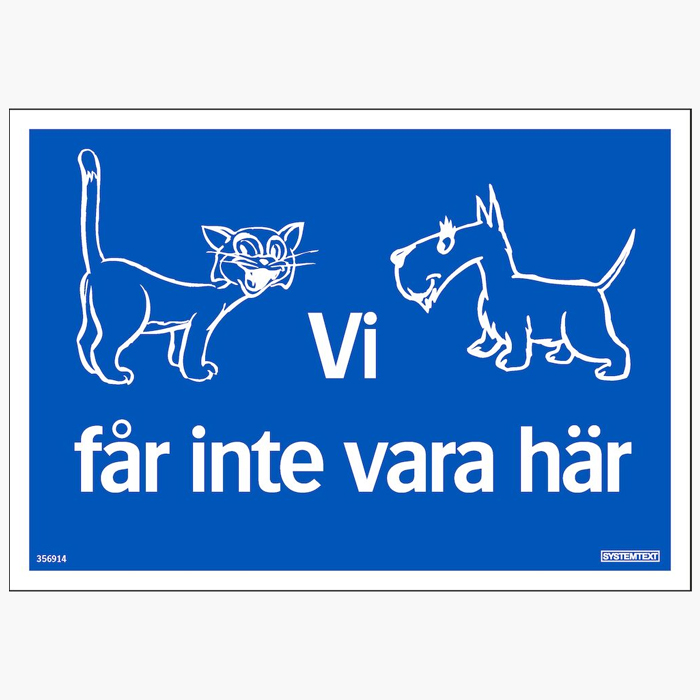 Vissa områden vill man hålla fritt från husdjur, då är denna skylten i hårdplast ett perfekt sätt att informera om detta. Skylten är 297x210 mm och monteras lätt med hjälp av t.ex. självhäftande tejp. Den kan även borras fast (levereras oborrad).