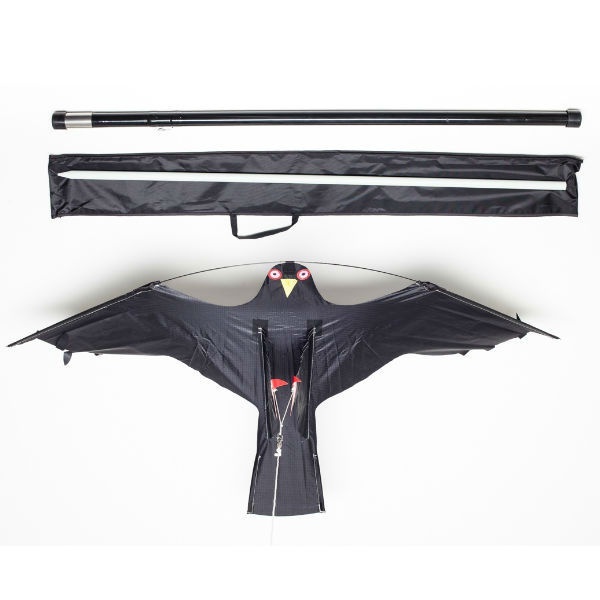 Med sitt naturliga sätt att flyga i vinden på toppen av en 6 meter lång teleskopstång upplevs denna rovfågelsliknande fågelskrämma oerhört naturtrogen.