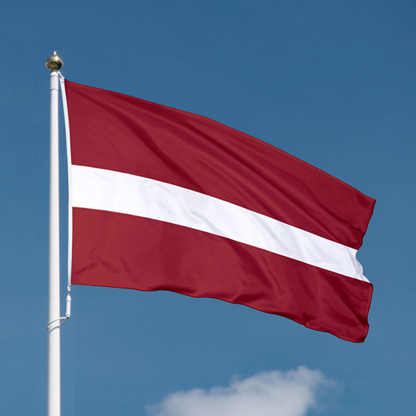 Lettisk flagga i 160 g marinpolyester, ett beprövat och slitstarkt tyg som är vävt av dubbelt, tvåtrådigt, tvinnat garn. Tillsammans med sömnaden vi använder ger detta material extra starka flaggor.