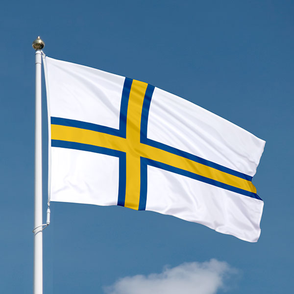 Norrländsk regionsflagga i 160 g marinpolyester, ett beprövat och slitstarkt tyg som är vävt av dubbelt, tvåtrådigt, tvinnat garn. Tillsammans med sömnaden vi använder ger detta material extra starka flaggor.