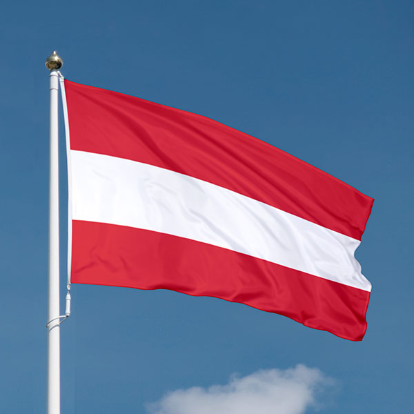 Österrikisk flagga i 160 g marinpolyester, ett beprövat och slitstarkt tyg som är vävt av dubbelt, tvåtrådigt, tvinnat garn. Tillsammans med sömnaden vi använder ger detta material extra starka flaggor.