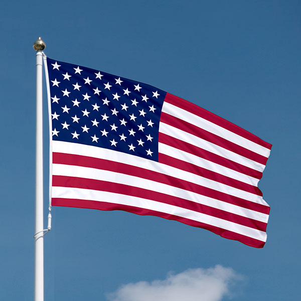Amerikansk flagga i 160 g marinpolyester, ett beprövat och slitstarkt tyg som är vävt av dubbelt, tvåtrådigt, tvinnat garn. Tillsammans med sömnaden vi använder ger detta material extra starka flaggor. Flaggan är tryckt och har således inga broderade stjärnor.