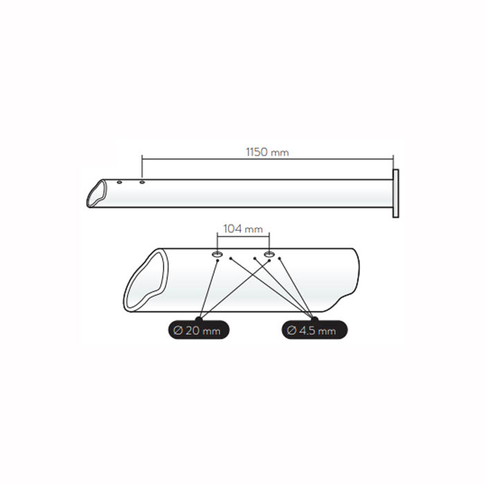 OBS! Kontrollera så att hålbilden på den befintliga flaggstången stämmer överens med våra mått så att luckan verkligen passar: c-c mått för linhålen, 104 mm Ø 20 mm.