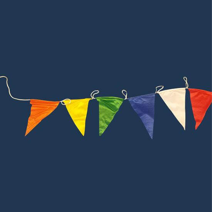30 stycken vimplar i olika färger som är monterade på en totalt 16 meter lång lina, perfekt för festen eller festivalen. Vimplarna är skurna i kanterna, är 20x30 cm och är monterade på 12 meter, den sista två metern per sida är kala för att fästa linan utan att påverka flaggornas placering. Vimplarna funkar lika bra till festen som inredningsdetalj.