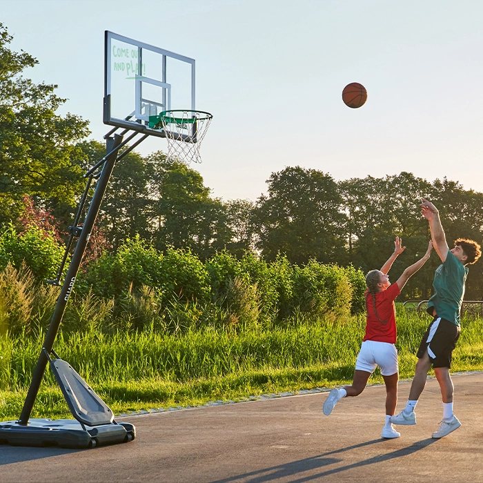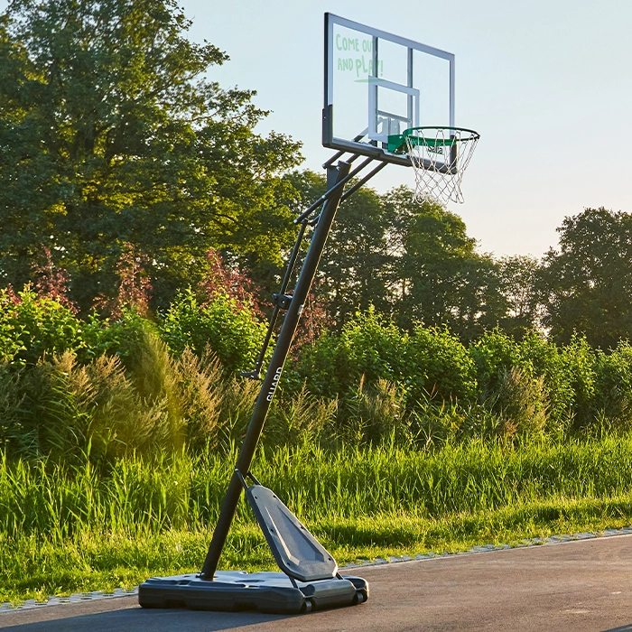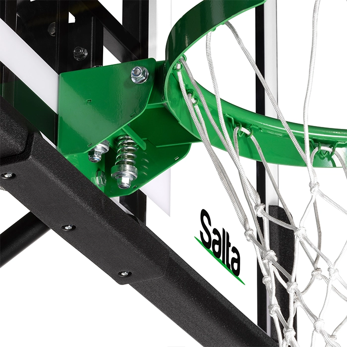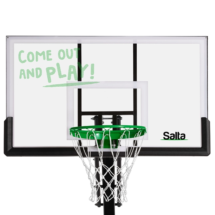 Den transparenta bakplattan är tillverkad av väder- och stöttåligt polykarbonat och förstärkt med en robust stålram för extra stabilitet. Plattan mäter 137 x 80 x 3 cm och ger en autentisk studs och spelkänsla. Tack vare den specialutvecklade korgen med dubbel kompressionsfjäder klarar Salta Guard även de mest kraftfulla dunkarna. Korgen har en diameter på 45 cm och är utrustad med ett vädertåligt nät.