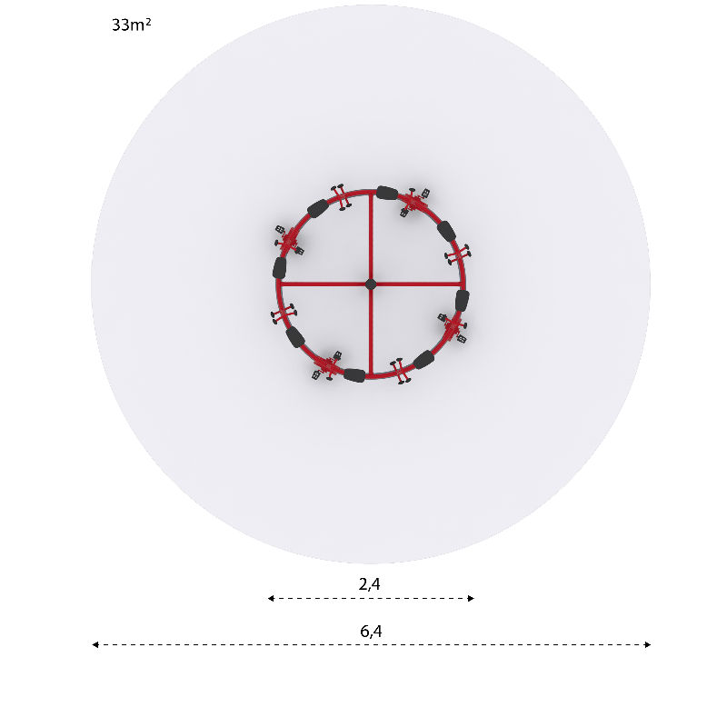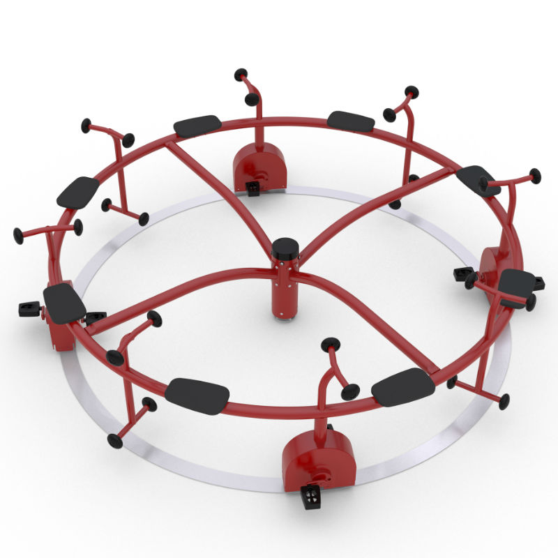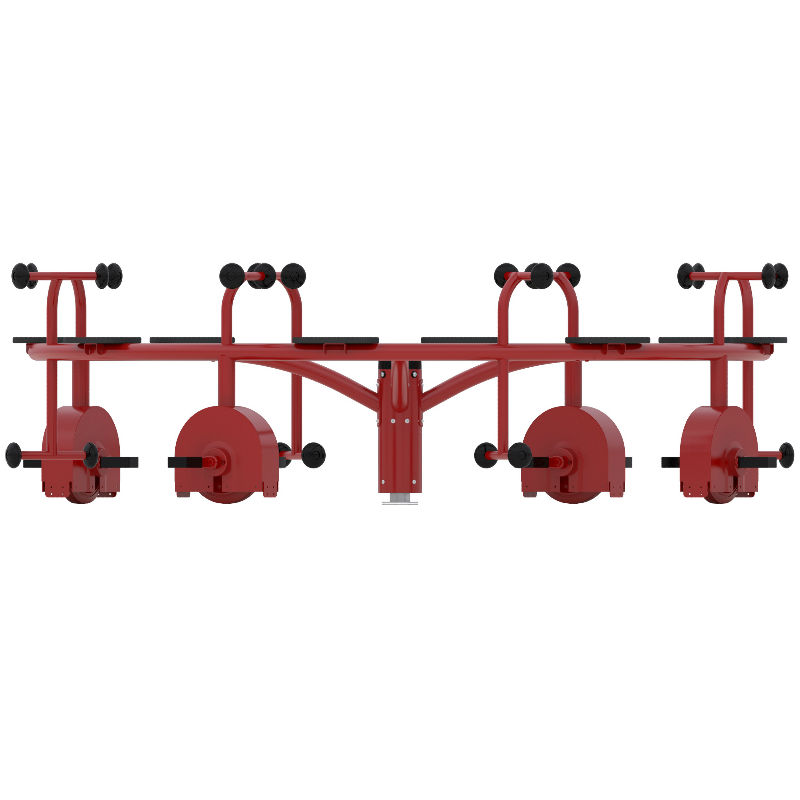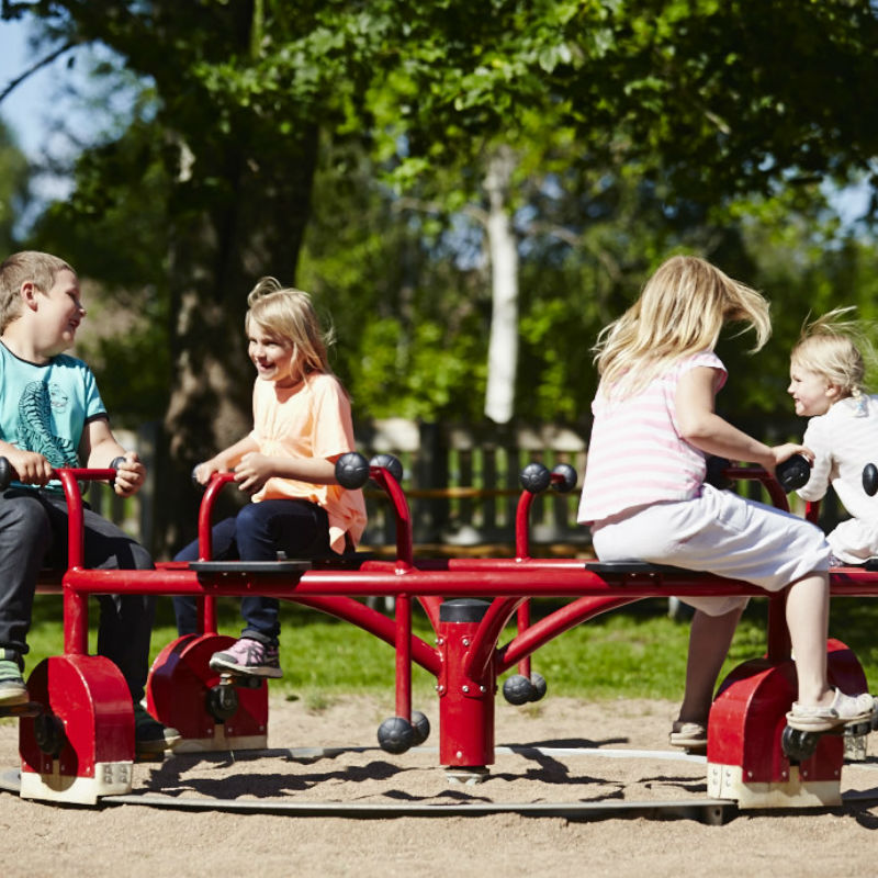 Karusellen har 8 platser varav fyra med pedaler. De kullagrade hjulen är skyddade och säkerheten är väl tillgodosedd. En naturlig samlingsplats för barn i olika åldrar att leka tillsammans.