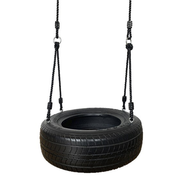 Däckgunga av målat återvunnet däck inklusive justerbara svarta rep, redo att monteras på gungställningen i trädgården. Justera längden på repen så att det är minst 35 cm mellan mark och gungsäte.