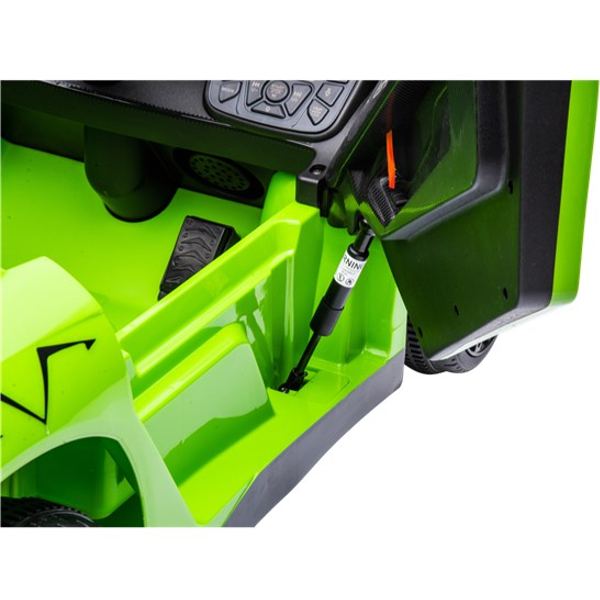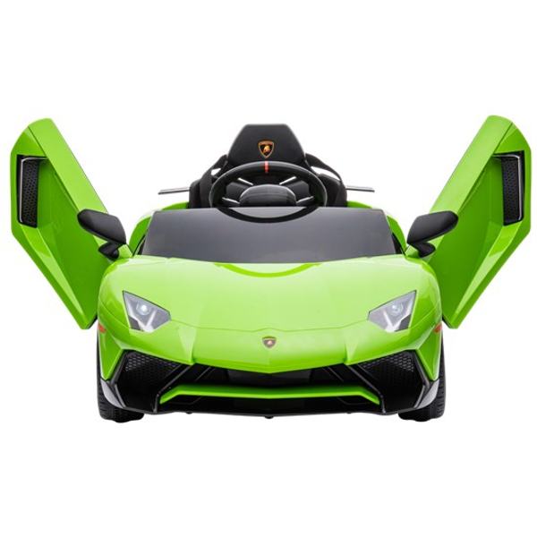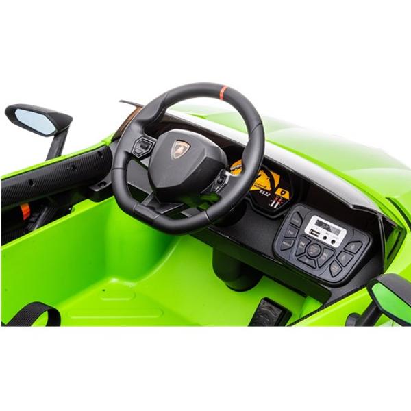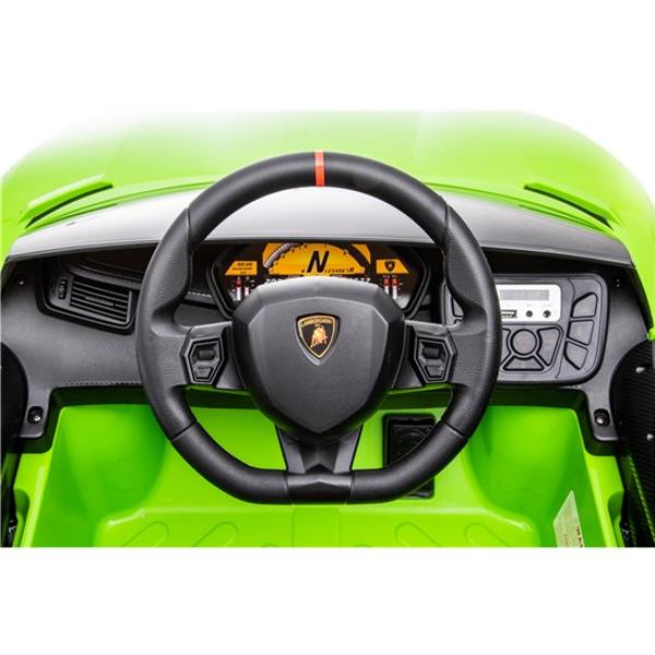 Bilen är utrustad med 2x25W motorer försedd med tre växlar framåt när fjärrkontrollen används och en backväxel. Lamborghinin kan köra upp till 4 km i timmen, och det kraftfulla 12V-batteriet ger lång batteritid. Bilen kan köras länge medan du lyssnar på de coola låtarna som redan är installerade. Det går även att lyssna på dina egna favoritlåtar via MP3-porten. Fjärrkontrollen som medföljer ger föräldrarna möjlighet att hjälpa till att styra bilen i början.
