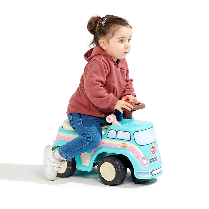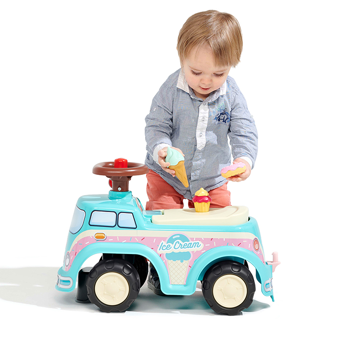 En gångbil i glassbilsutförande, perfekt för att varma dagar leverera glass till nära och kära, levereras inklusive en uppsättning leksaksglassar. Under sätet gömmer en lucka där leksaksglassarna kan förvaras under färden. Bilen är lätt att hantera och ratten är utformad med en tuta för att göra omgivningen uppmärksam att man är på väg.