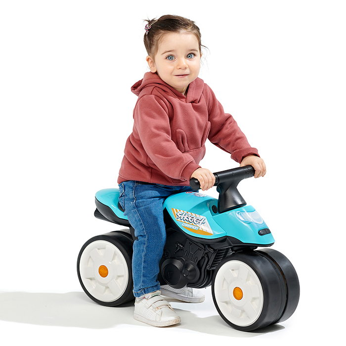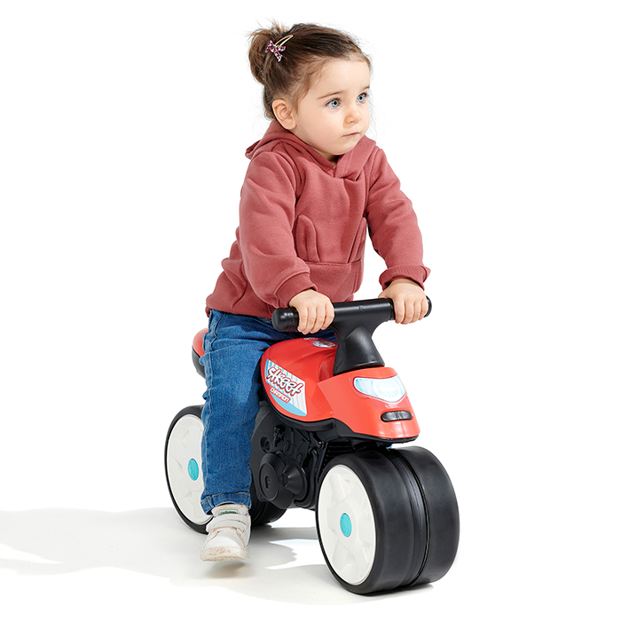 En "ride on"-motorcykel för barn mellan 1 till 3 år där barnen både tränar balans och grovmotoriken på ett fantasifullt sätt, finns i både blått och rött utförande. Välj i rullistan vilken färg som önskar på motorcykeln.