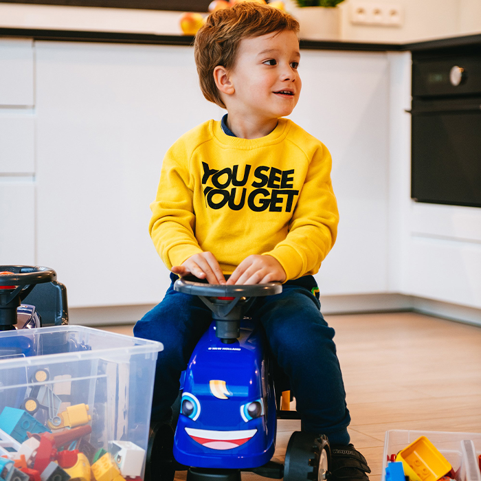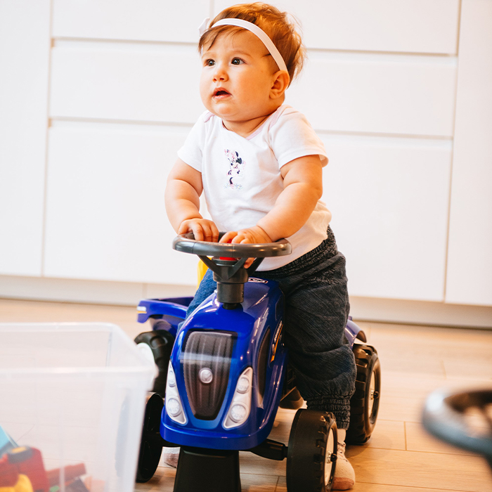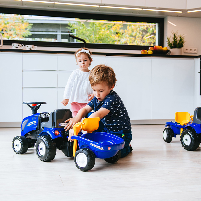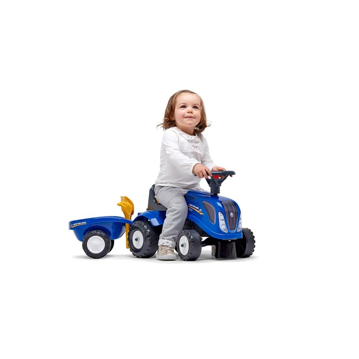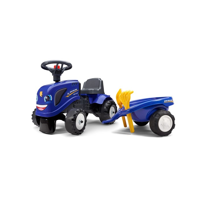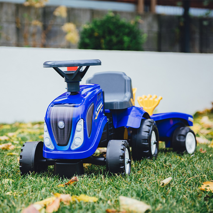 En gångtraktor ljusblå New Holland-traktor till småbarn från 1 år. Den är rolig med sina formade kurvor som gör små trädgårdsmästare glada dess ljusa färger är perfekta för att fånga ditt barns uppmärksamhet och som också kan utveckla dess motoriska färdigheter och balans medan barnet har kul. Kan användas både i trädgården eller inomhus tack vare den vridbara ratten med tuta. Den söta lilla traktorn är utrustad med ett släp inklusive skyffel och kratta. Den kan lätt bli barnets favoritsätt att transportera sin favoritfilt från sovrummet till vardagsrummet eller för små utflykter utomhus, t.ex. till sandlådan. Ett litet kit ingår, så att ditt barn kan välja stil och en anpassad registreringsskylt.