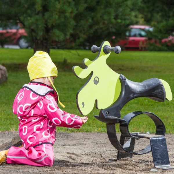 Fjädergunga Älgen är ett perfekt komplement till sandlådan eller lekplatsen. Då en fjädergunga inte tar upp mycket plats kan man få in dom på de flesta ställena. Gungdjuret ger inspiration till fantasifull lek som och uppskattas av barn i åldern 2-5 år.