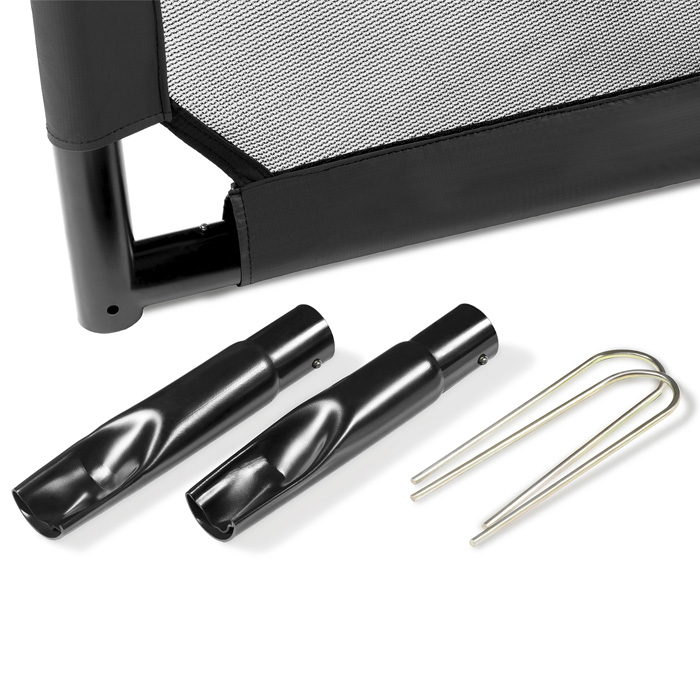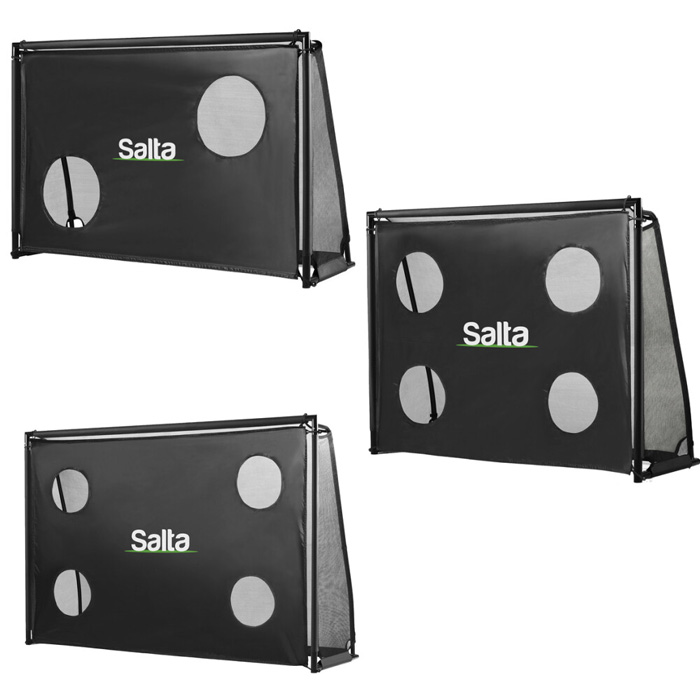 Träna på fotboll med detta fotbollsmål som levereras med en fotbollsduk (sharpshooter) med hål i för att öva prickskytte, finns i tre olika storlekar. Målet är lätt att montera och kommer levererad med förankringkit i form av två jordspett samt två u-spett beroende på underlaget.