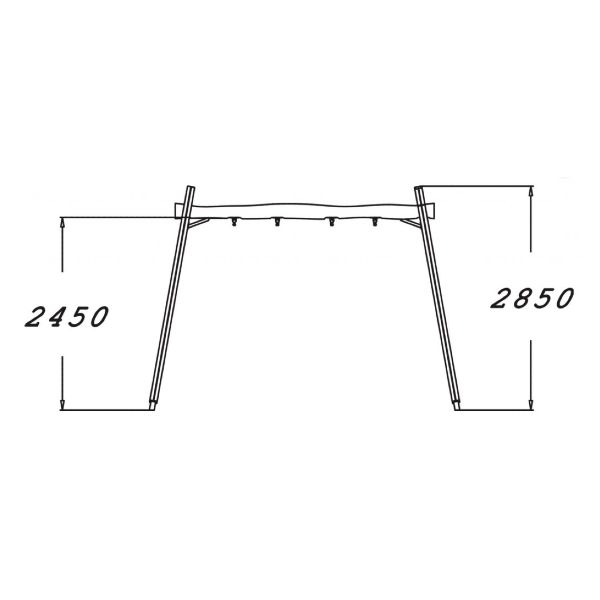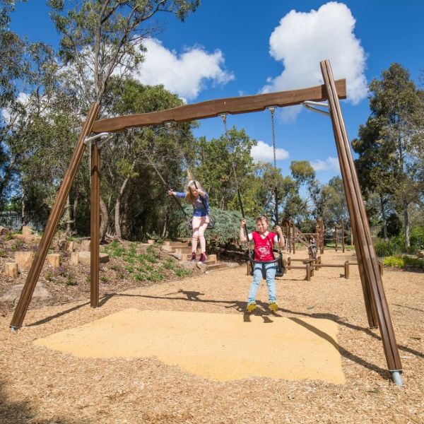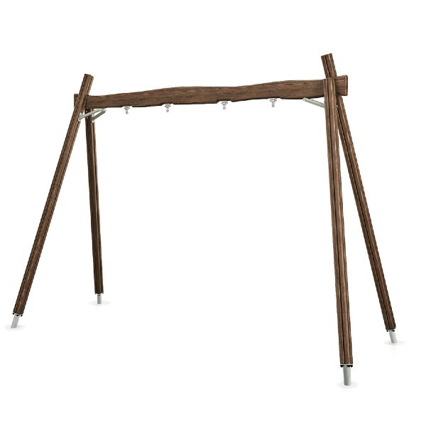 Gungställning med plats för två fritt valbara gungsäten tillverkad i trä med mjuka linjer för att på ett naturligt vis smälta in i skogsmiljön. Denna gungställning ger lekplatsen extra atmosfär och bidrar till fantasifull lek.