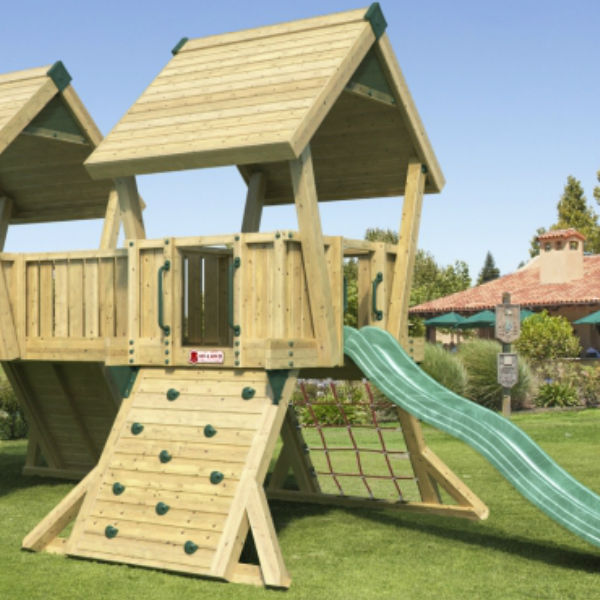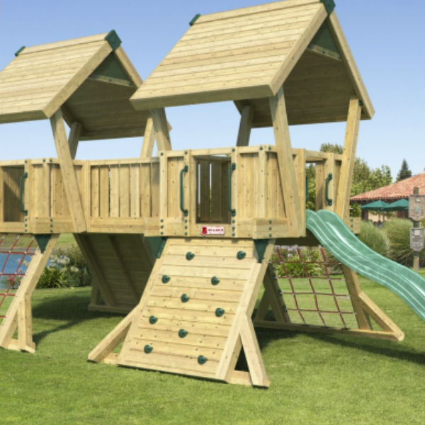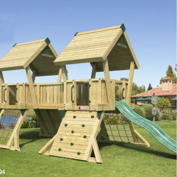 Projekt Q4 består av två torn försedda med trätak samt en klättervägg och ett klätternät och en rutschkana. De två tornen är sammanbundna med en bro vilket inleder till massor av lek. Denna klätterställning är ett mycket prisvärt alternativ som smälter in i de flesta miljöer tack vare sitt neutrala utseende. Utrustningen kräver minimalt underhåll och är enkla att montera. Träet består av NTR-A impregnerad furu, som garanterar lång hållbarhet och levereras i avskurna dimensioner redo att montera.