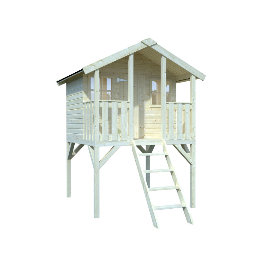 Lekstuga Toby plattform upphöjd cirka 1,2 meter och försedd med en liten altan samt trappa och är tillverkad i obehandlad gran. Själva stugans storlek är 2,1 kvm.