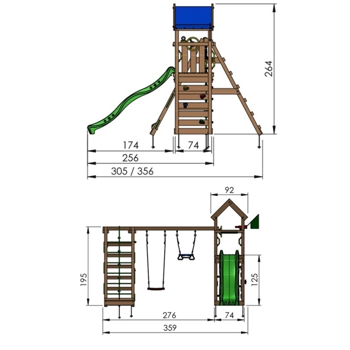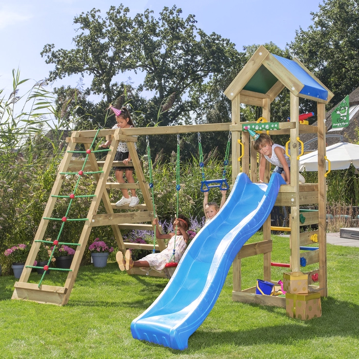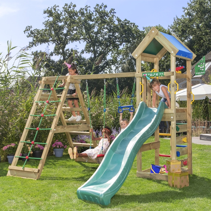 Jungle Gym Patio-lektornet finns med både grön och blå rutschkana, vilket gör det enkelt att anpassa efter din trädgård och dina önskemål. Det är en perfekt lekplats för barn och ett stilrent tillskott till trädgården eller som en förlängning av familjeterrassen. Medan barnen utforskar och leker kan föräldrarna njuta av det goda vädret i närheten.