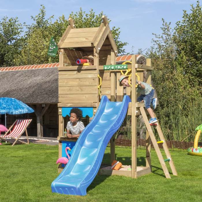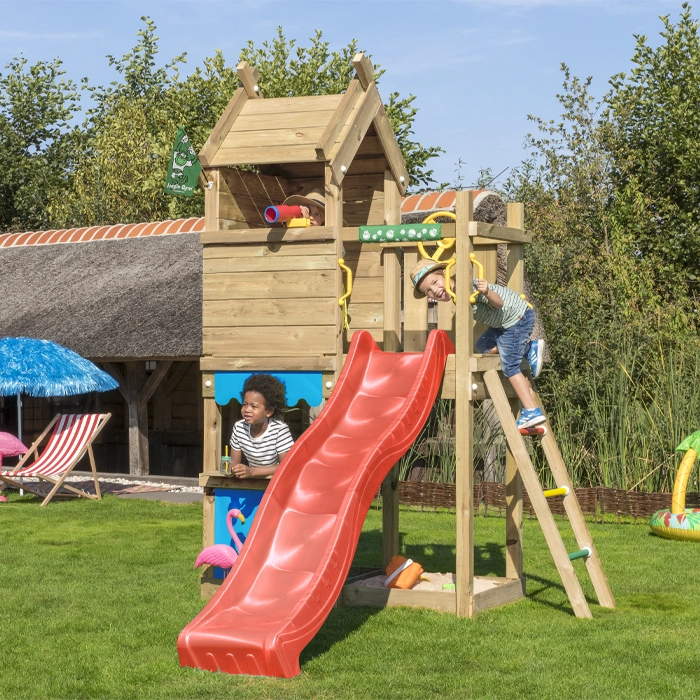 Lektornet Jungle Gym Resort är den perfekta kombinationen av modern design och inbjudande semesterstil, finns med både blå och röd rutschkana. Med denna lekställning skapar du en rolig och trygg miljö för barnen att utforska. Låt de små klättra, leka i sandlådan eller ta en tur nerför rutschkanan för extra spänning. Den charmiga minimarknaden och den mysiga lekbutiken gör leken ännu mer verklighetstrogen.