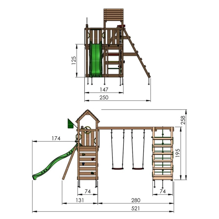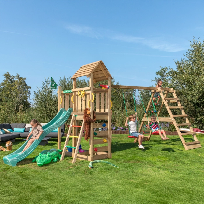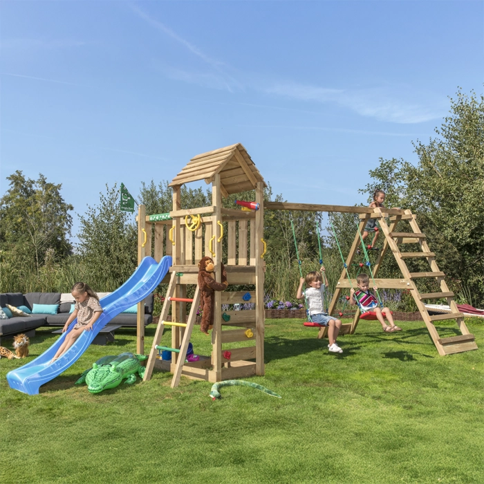 Paketet innehåller alla nödvändiga delar såsom klättervägg, klätterstenar, trestegstege, handtag, jordankare, skruvar och beslag, trätak, StarOscope™ (Teleskop), Jungle Steering Wheel™ (ratt), Jungle Gym-flagga, klätterställning med två röda gungor, huvudskydd, sandlåda och manual. För montering rekommenderas två personer och en beräknad tid på cirka fyra timmar.