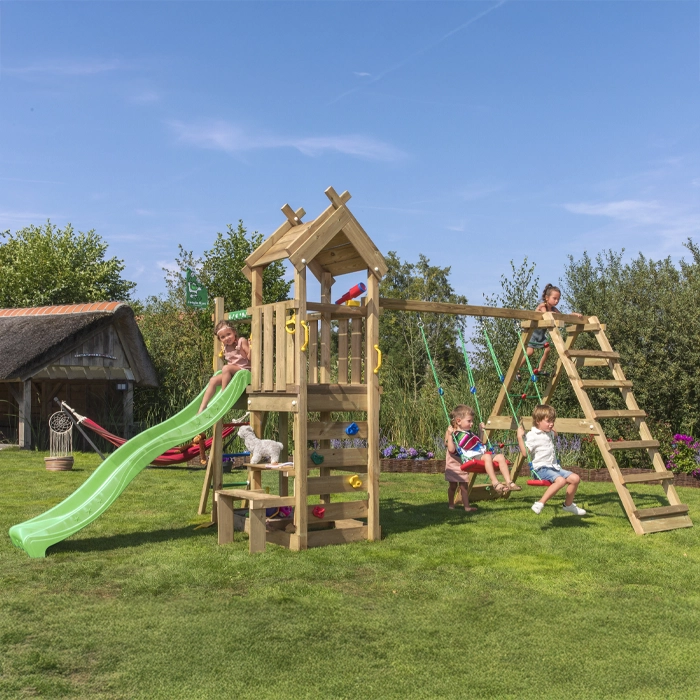 Jungle Gym Teepee 2-klättermodul finns med både grön och gul rutschkana och är den perfekta lekplatsen för äventyrliga barn. Med en kompakt design som smälter in i trädgården erbjuder den en mysig och hållbar plats för lek. Barnen kan klättra på klätterväggen, ta sig upp via den lutande stegen eller söka skydd under det trätäckta lekhuset. För ännu mer skoj finns en integrerad sandlåda och ett picknickbord – perfekt för små pauser mellan äventyren.