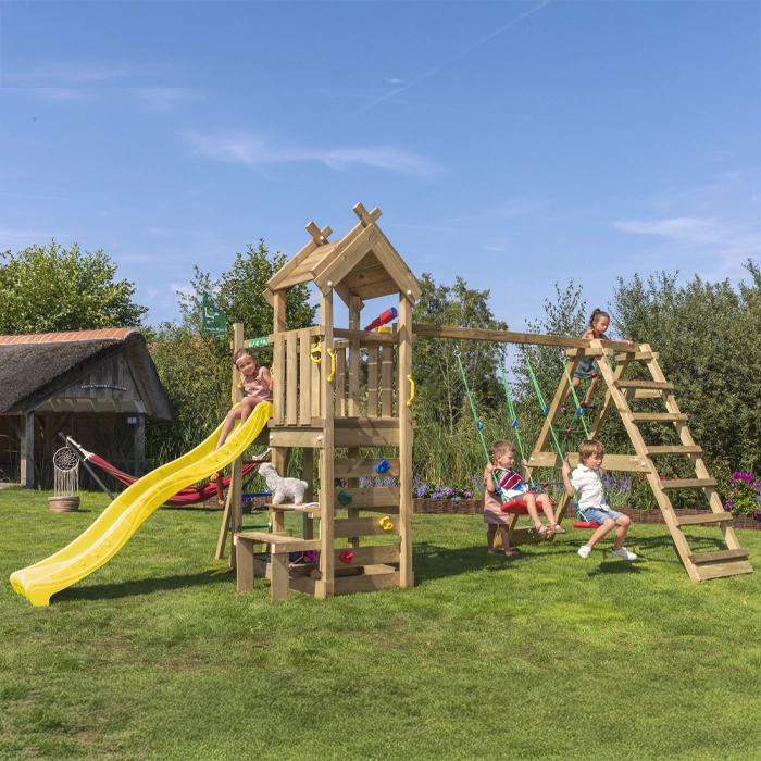 Med sin rustika design förvandlar Jungle Teepee din bakgård till en lekvänlig oas. Klätterställningen är utrustad med roliga tillbehör som ratt, teleskop, klätternät och en gunga med slitstarkt polyesterrep. Jungle Gym-flaggan vajar stolt och inbjuder till lek, medan den stabila konstruktionen garanterar många timmars säker underhållning.