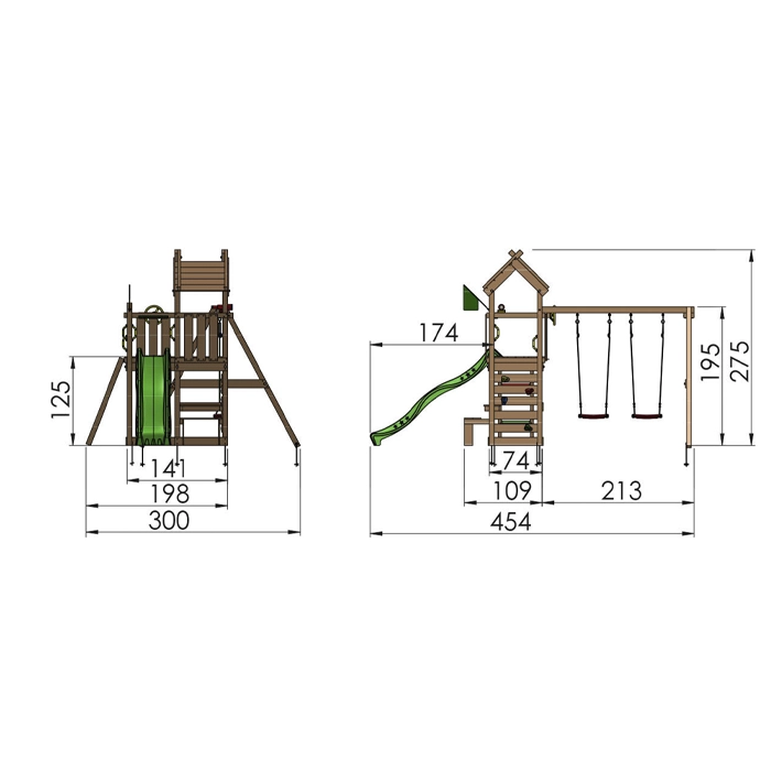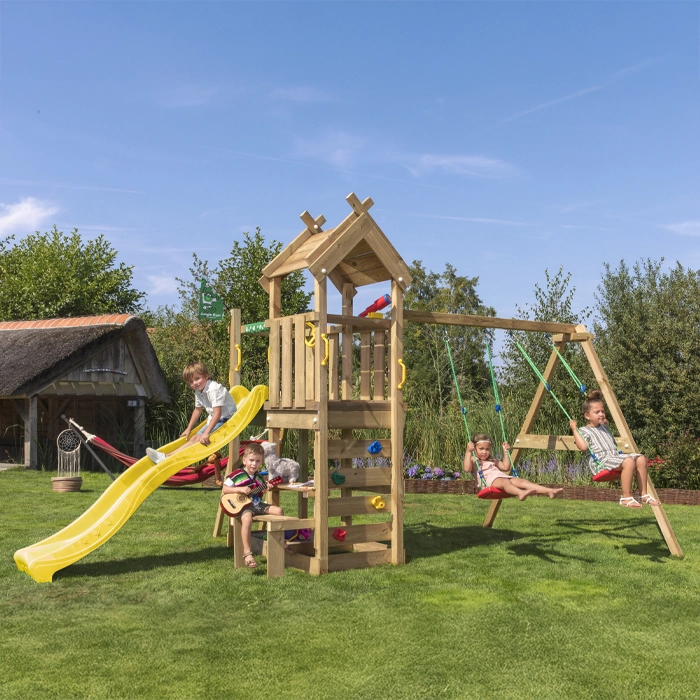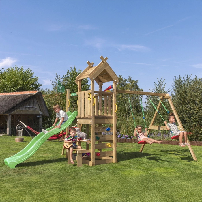 Jungle Teepee 2-gungsmodul är en mysig och hållbar klätterställning för barn, utrustad med en rutschkana i grönt eller gult för extra lekglädje. Denna kompakta lekställning tar plats i hjärtat av leken utan att dominera trädgården. Barnen kan klättra upp via klätterväggen eller den lutande stegen, hitta skugga under lekplatsens tak eller samla vännerna för en mysig stund vid det inbyggda picknickbordet. För de som älskar att gunga blir den stabila gungställningen en favorit.