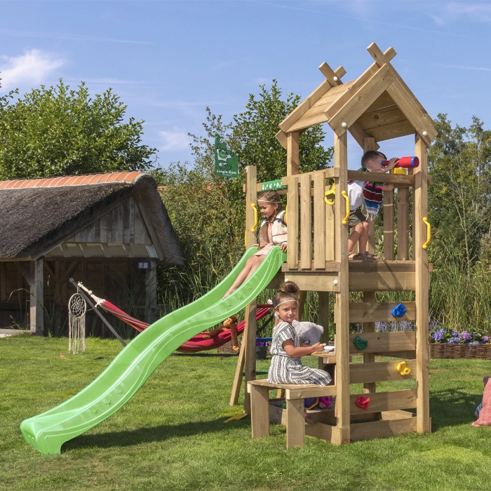 Jungle Teepee är en mysig och hållbar klätterställning som blir barnens favoritplats i trädgården, finns med både grön eller gul rutchkana. Med sin kompakta design ger den maximalt med lek på minimal yta. Här kan barnen klättra uppför en klättervägg eller en lutande stege, ta skydd i lekstugan eller duka upp till fest vid det integrerade picknickbordet.