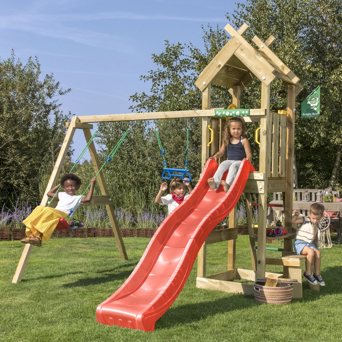 Jungle Totem 2-gungsmodul är ett stilfullt och kompakt lektorn som passar perfekt i alla trädgårdar. Modellen finns med både blå och röd rutschkana, där man dessutom kan anslutas till en trädgårdsslang för extra somrig lek. Med en holländsk design och en bohemisk twist blir denna lekställning snabbt barnens favorit. Här finns allt för fartfyllda lekar – en sandlåda att gräva i, en rutschkana att susa nerför och ett mini-picknickbord där barnen kan samla energi mellan leken.