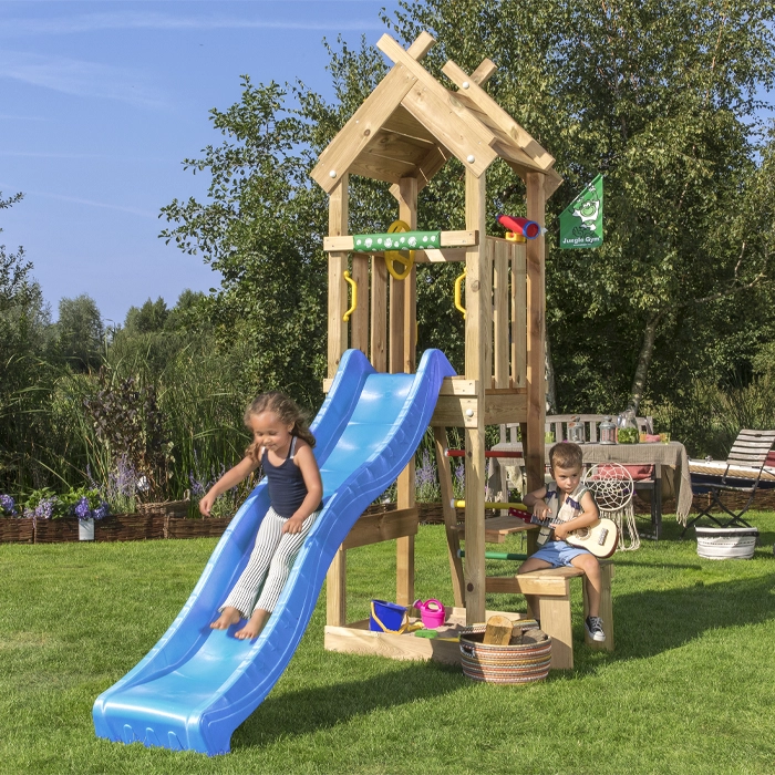 Jungle Totem är en modern och kompakt lekställning som finns med både blå och röd rutschkana – båda med möjlighet att ansluta trädgårdsslang för extra lekglädje. Med sin eleganta holländska design och bohemiska twist blir den ett stilfullt inslag i alla trädgårdar. Här kan barnen samla sina vänner för en picknick vid det integrerade bordet eller låta fantasin flöda i den inbyggda sandlådan. Med en plattformshöjd på 125 cm får de dessutom en perfekt utsikt över sina äventyr.