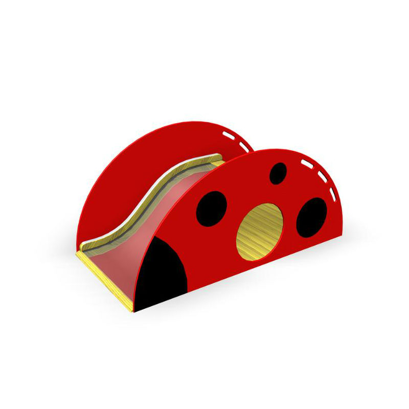 Med en enklare trappa upp, en bred och låg rutchkana i metall, en sarg i formen av en nyckelpiga och med ett krypin på sidan gör denna rutschkana till en enkel men underhållande lek för småbarn. Rutschkanan är tillverkad i slittåliga material för att klara av ofentliga utomhusmiljöer.