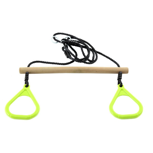 Trätrapets med plastringar i som barnen älskar att leka med. Upphängningsringarna är i kraftig metall och ringarna har god UV-beständighet.
