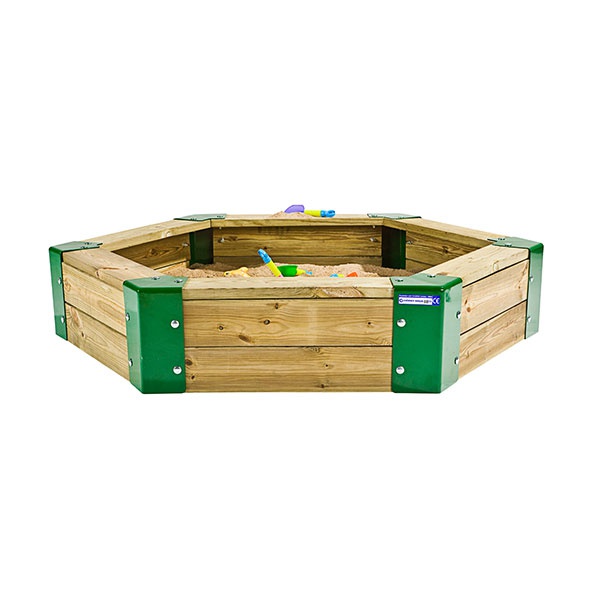 Denna sexkantiga sandlåda är tillverkad i kraftiga, tryckimpregnerade brädor. Hörnen är förstärkta med kraftig UV-beständig plast och har bekväma sittbräda på alla sidor.