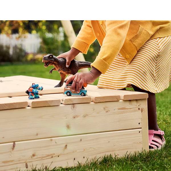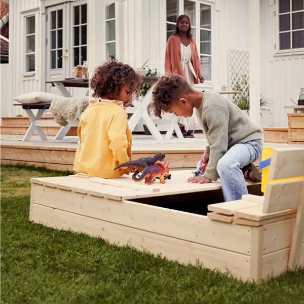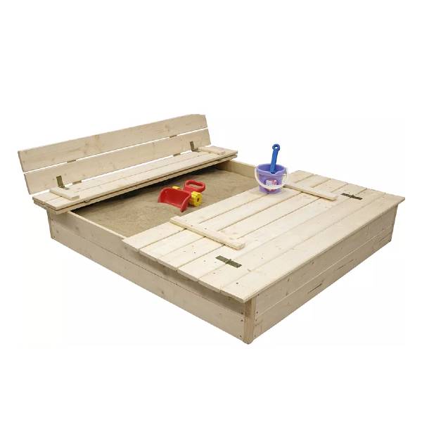 Denna sandlåda är tillverkad av FSC®-certifierade gran och är försedd med ett lock som går att fälla upp och bli till en bänk. Locket är tacksamt för att slippa oönskade besök från katter eller andra djur när den inte används. Tack vare storleken på 120x120 cm får flera barn plats att leka samtidigt. Sandlådan kommer omonterad och är mycket enkel att montera ihop. Då trät är obehandlat kan man måla den i egenönskad kulör.